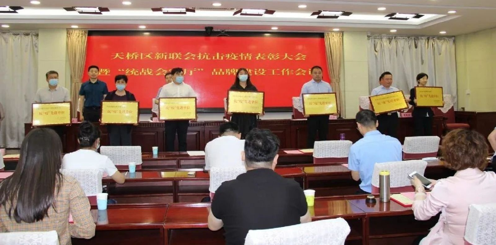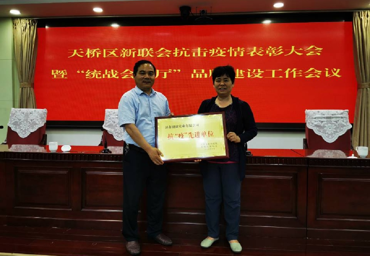 會上(shàng),曹新峰同誌宣讀了《關於表彰天橋區新聯會抗疫先進單位和先進個人的決定》。齊振虎(hǔ)巡視員為受表彰的抗疫先進單位及先進個人代表頒獎。我公司與時代總部(bù)基地其(qí)它(tā)9家授獎單位(wèi)一起參加了這次頒獎(jiǎng)大會。