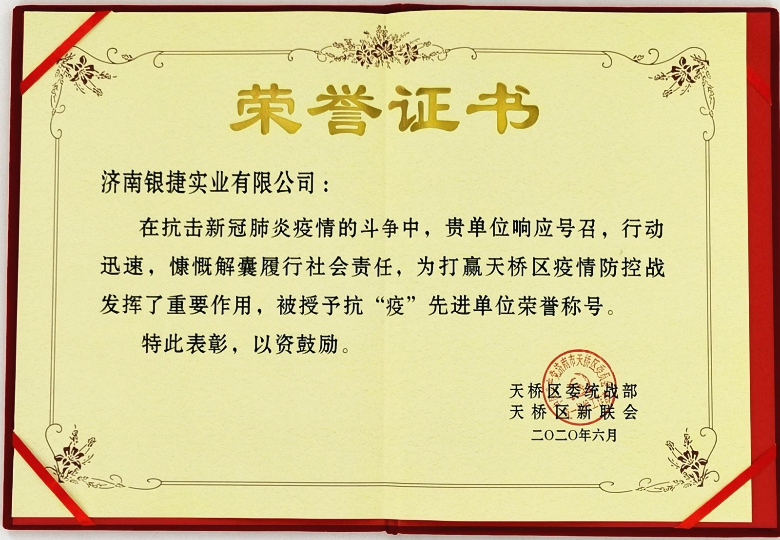 自(zì)新型冠狀病毒肺炎疫情爆發以來,我公(gōng)司積(jī)極響應,第一時間進行捐款活動,堅持每日對辦公樓進行消毒、給員工測體溫,外地(dì)回濟員工隔離14天等防疫措施,為打贏這次疫情防控戰貢獻出了一點微薄之力,卻受到天橋區委統戰部授予的“抗疫(yì)先進單(dān)位”的稱號。對此,我們感(gǎn)到無比的光榮,同時也激發了我們進一(yī)步響應政(zhèng)府抗(kàng)疫號召的意誌。